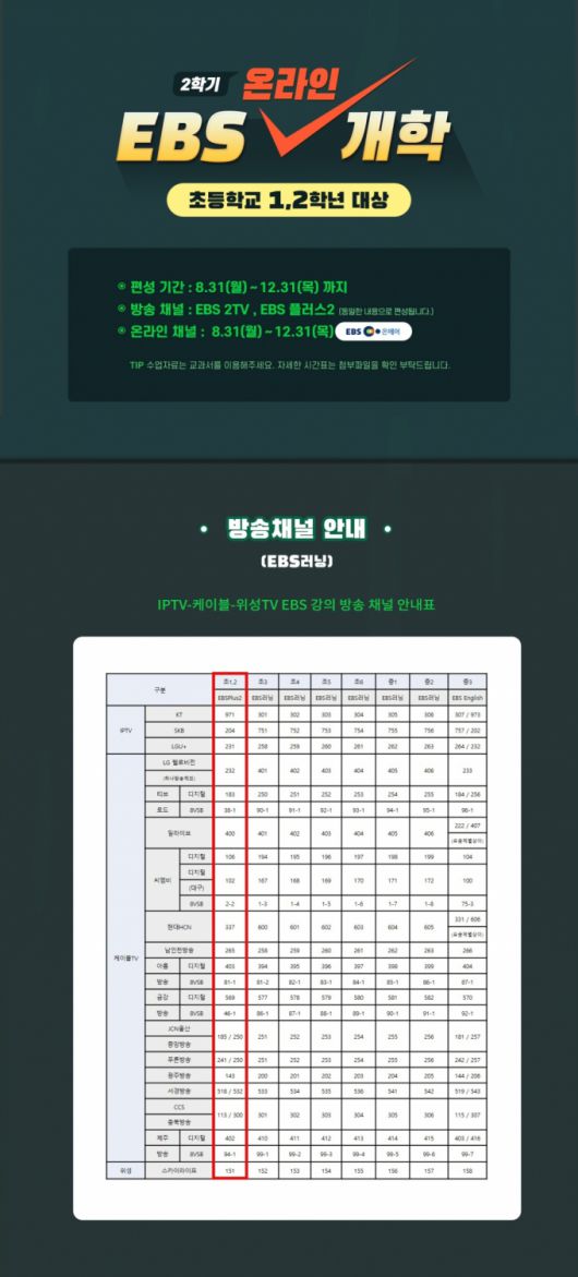 EBS는 2학기 개학을 앞두고 코로나19가 급격히 재확산함에 따라 초등학교 3학년부터 중학교 3학년까지 7개 학년을 대상으로 'EBS 온라인 개학'을 긴급 추가 편성한다고 28일 밝혔다. 학습 공백 최소화를 위해 기존의 초등 1,2학년 대상 프로그램을 포함해 모두 9개 학년을 대상으로 서비스를 확대한 것이다.