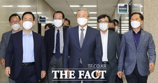 김종인 미래통합당 비상대책위원장이 28일 오전 화상으로 진행한 비대위회의에서 "지금은 모든 노력을 코로나19 확산 저지에 모아야 한다"며 "정부가 의료진에 (파업 철회를) 추궁만 할 것이 아니라 의료진들이 헌신적으로 코로나19 퇴치를 위해 노력하도록 여건부터 만들어야 한다"고 밝혔다. 김 위원장과 통합당 중진의원들이 지난 26일 오전 국회에서 열린 비대위원장-중진의원 회의에 참석하는 모습. /배정한 기자 |