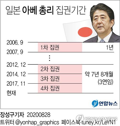 아베 총리는 2012년 12월 26일 내각을 출범한 후 7년 8개월 넘게 연속 재임하며 일본의 역대 최장수 총리 기록을 새로 썼다.