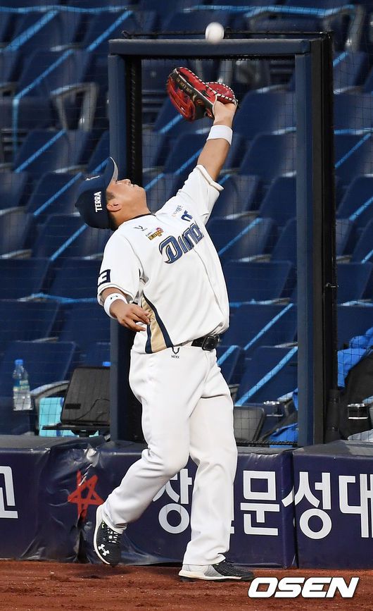 [OSEN=창원, 민경훈 기자] 28일 오후 창원 NC파크에서 ‘2020 신한은행 SOL KBO리그’ NC 다이노스와 두산 베어스의 경기가 열렸다. 1회초 2사 주자 1,2루 두산 최주환의 파울타구를 NC 1루수 강진성이 달려가 잡아내고 있다./ rumi@osen.co.kr