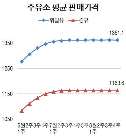 [이데일리 경계영 기자] 전국 휘발유 가격이 ℓ당 평균 1361원대에서 5주째 맴돌고 있다.