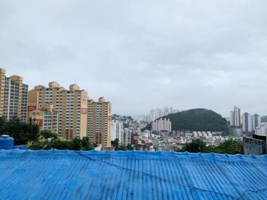 이런 마을은 우연히 마주친 바로 그때 답사하지 않으면, 그 다음에 갔을 때에는 허허벌판으로 바뀌어 있는 경우가 대부분이다. 그래서 곳곳에 ‘철거’라고 페인트로 거칠게 적힌 골목길을 걸으며, 간혹 만나는 주민분들께 깊숙히 고개 숙여 인사하며 급히 마을을 돌아보았다. 그리고는 가파른 산길을 15분쯤 걸어 오르자 전포돌산과 황령산을 잇는 능선이 나타났다. 돌산길과 진남로283번길이 만나는, 속칭 안동네 벽화마을의 최정상 지점이었다. 남쪽으로 뻗어있는 깊은 계곡에는 단독주택부터 고층아파트까지, 현대 한국의 거의 모든 건물 형태가 뒤섞여 있었다.