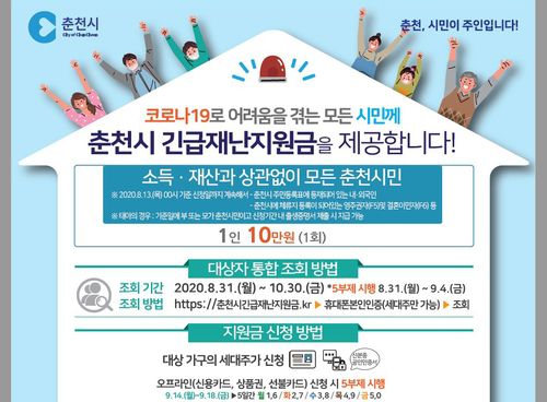 한편 춘천시는 24일부터 긴급재난지원금 지급을 위한 콜센터(☎033-245-5900)를 운영하고 있다.