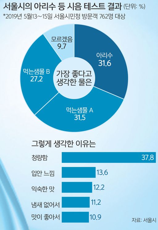 수돗물은 생수나 정수기 물에 비해 맛도 좋은 편입니다. 앞서 말씀드린 수돗물평가위는 미네랄 함유량도 조사합니다. 칼슘과 칼륨, 나트륨, 마그네슘 등 미네랄이 20∼100㎎/L 함유돼 있으면 건강하고 맛있는 물로 평가됩니다. 미네랄은 같은 조사 지점 수돗물에서 27.3㎎/L 검출된 반면 정수기 물은 1.18㎎/L에 불과했죠. 실감이 안 나신다고요? 서울시는 지난해 5월 시청사 방문객 762명을 대상으로 저와 생수 2종에 대해 블라인드 테스트를 진행했는데 235명(31.6%)이 ‘가장 좋다고 생각한 물’로 저를 꼽아주셨습니다.