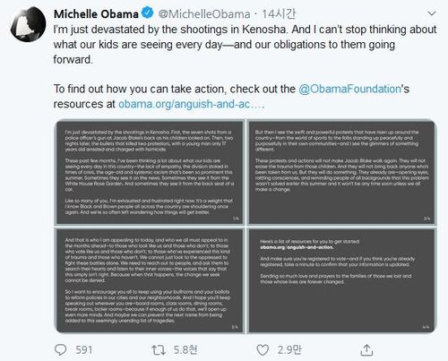 미셸 여사는 28일(현지시간) 트위터에 올린 성명에서 "위스콘신주 커노샤에서 흑인 제이컵 블레이크가 자녀들이 보는 앞에서 경찰에 총을 7발이나 맞고, 이틀 뒤 17세 청소년이 시위대를 총격해 2명이 사망하는 사건이 발생한 것을 보고 엄청나게 충격받았다"면서 "여러분처럼 지치고 좌절한 상태"라고 밝혔다.
