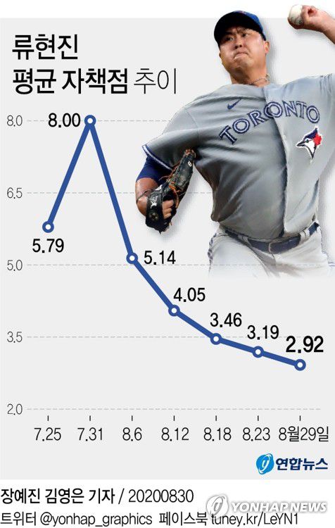 (서울=연합뉴스) 장현구 기자 = 류현진(33·토론토 블루제이스)의 평균자책점(ERA)이 하루 만에 바뀌었다.