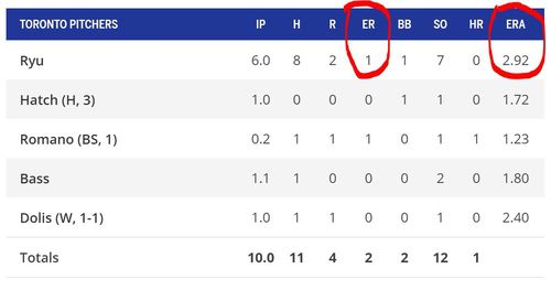 이에 따라 류현진의 시즌 평균자책점은 3.16(37이닝 13자책점)에서 2.92(37이닝 12자책점)로 낮아졌다.