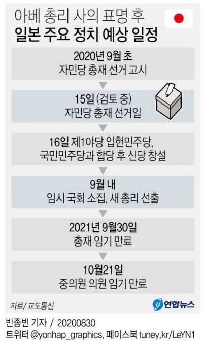 30일 NHK에 따르면 총재 선출과정 진행을 맡은 니카이 도시히로(二階俊博) 자민당 간사장은 전날 밤 모리야마 히로시(森山裕) 자민당 국회대책위원장 등과 만나 다음달 13~15일쯤 중의원·참의원 양원 총회를 열어 현역 의원과 47개 도도부현(都道府縣·광역자치단체) 대표가 투표를 통해 새 총재를 선출하기로 의견을 모았다. 총재 선출 방식인 오는 1일 개최되는 자민당 총무회에서 최종 결정되지만, 관련 권한이 니카이 간사장에서 일임된 상태여서 다음달 중순에는 사실상 새 총리가 결정될 것으로 보인다.