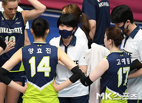 현대건설 이도희 감독이 작전지시를 하고 있다.