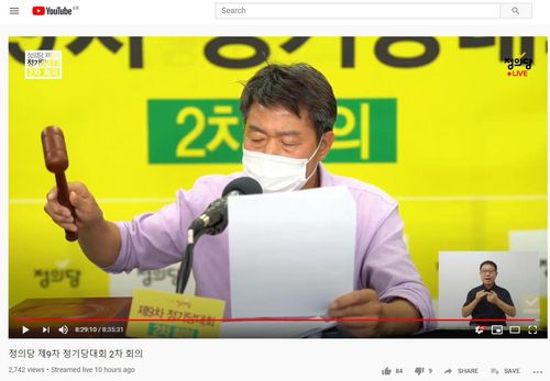 (서울=연합뉴스) 30일 온라인으로 진행된 정의당 제9차 정기당대회에서 여영국 의장이 안건 의결을 선포하고 있다. [유튜브 캡처. 재판매 및 DB 금지] |