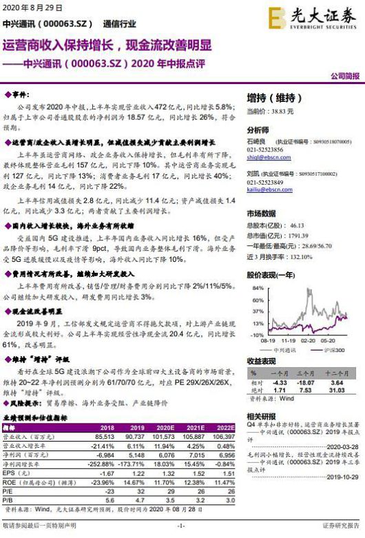이에 따라 광다(光大)증권은 ZTE에 대한 2020~2022년 지배주주 귀속 순이익을 60.76억/70.15억/69.56억 위안으로 제시했다. 이는 각각 전년 대비 18.03%/15.45%/-0.84% 늘어나는 수치다. 같은 기간 예상 주당순이익(EPS)은 각각 1.32/1.52/1.51위안으로, 예상 주가수익배율(PE)은 29/26/26배로 전망했다. 그러면서 투자의견을 ‘비중확대'로 제시했다.