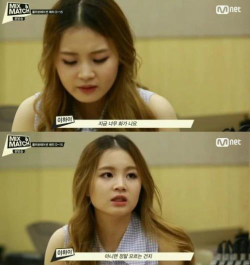 2014.10 케이블채널 Mnet ‘믹스 앤 매치’에 출연한 이하이. 심사를 앞두고 콜라보레이션 연습을 하는 과정에서 전혀 어우러지지 않고 화음이 제대로 맞지 않는 모습을 보였고 멤버들은 상황의 심각성을 깨달았다. 이에 결국 이하이가 분노하고 말았다.(사진=Mnet ‘믹스앤매치’ 방송 화면 캡처)