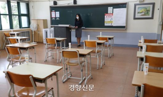 지난 5월 서울 용산의 한 중학교에서 담임교사가 등교 개학을 준비하며 학생들의 책상 위에 손 소독제를 놓고 있다. |이상훈 선임기자 |