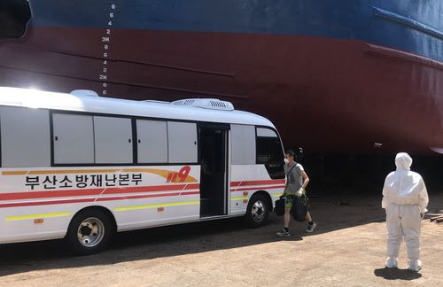 영도 수리조선소에서 구급차에 올라타는 러시아 선원. /연합뉴스 |