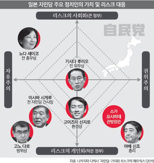 스가 장관은 후보군 중 아베 총리와 가장 유사한 정치·정책관을 가지고 있다. 정치학자 나카지마 다케시 도쿄공업대 교수가 주요 정치인 9명을 분석한 ‘자민당 - 가치와 리스크의 매트릭스’(2019)에 따르면 아베 총리와 마찬가지로 정부 지원보다는 개인의 자기 책임을 강조하는 작은 정부를 지향하고, 권위주의 가치를 선호한다. 개헌과 집단자위권에 찬성하며, 핵무장 검토 필요성도 언급했다.