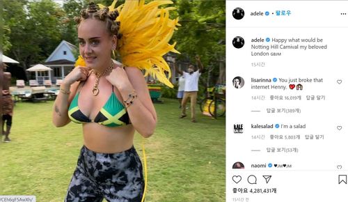 이에 맞춰 아델은 자메이카 국기 무늬의 비키니를 입고 전통 아프리카인 헤어스타일인 '반투 올림머리'(Bantu knots)를 한 자신의 모습을 찍어 게시했다.