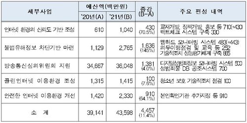 (서울=연합뉴스) 조성흠 기자 = 정부가 n번방 사건의 재발을 막기 위해 불법 유해정보 차단과 인터넷 이용환경 개선 등에 내년 436억원의 예산을 투입한다. 재난방송 운영 지원, 디지털 미디어 활용 교육 등 신종 코로나바이러스 감염증(코로나19) 이후에 대한 대비도 강화한다.