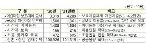 내년 예산안에서는 우선 신혼부부와 청년 주거안정을 위해 이들을 대상으로 임대주택 공급물량을 올해보다 2만3000가구가 늘어난 11만가구를 공급하기로 했다. 이를 위해 올해보다 2조393억원 늘어난 12조1319억원의 예산을 편성했다. 또 맞벌이 근로자들의 육아 환경 개선을 위해 워라밸 일자리장려금, 유연근무제 간접노무비, 육아휴직 지원금 총액을 1조2904억원 편성해 올해보다 661억원 늘렸다.