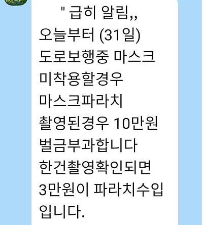 카카오톡과 같은 모바일 메신저도 코로나19 관련 가짜뉴스 우범지대다. '마스크 파파라치'라는 제목의 글에 따르면, "31일 광주 시내 도로 보행 중 마스크 미착용 시 마스크 파파라치 촬영된 경우 10만 원의 벌금이 부과된다. 1건 촬영 확인되면 3만 원이 수입이다. 주위 분들에게도 알려주세요"라는 내용이 담겼다.