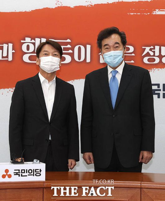 이낙연 더불어민주당 신임 당대표가 1일 오전 서울 여의도 국회에서 국민의당 당대표실을 찾아 안철수 대표(왼쪽)와 기념사진 촬영을 하고 있다. / 국회=배정한 기자 |