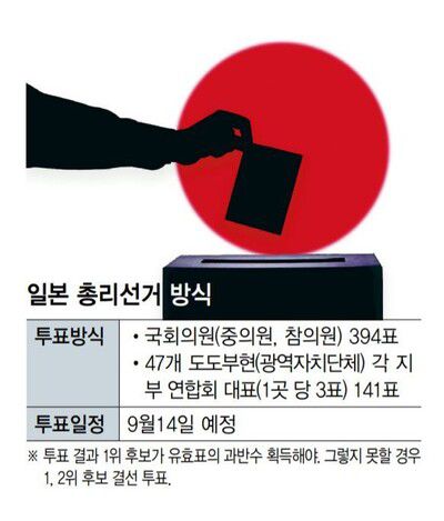 의원내각제인 일본은 집권 자민당 총재가 총리에 오른다. 자민당 규정에는 총재를 선출할 때 국회의원(394표)과 당원(394표)에게 표를 똑같이 부여하도록 돼 있다. 다만 긴급한 상황에서 약식으로 중·참의원 양원 총회에서 국회의원과 47개 도도부현의 각 지부 연합회 대표(1곳당 3표, 총 141표)들이 선출할 수 있도록 예외를 두고 있다. 양원 총회는 전체 투표수 535표 중 국회의원 몫이 74%를 차지해 당내 의원들의 모임인 파벌이 총리 선택을 좌지우지할 수 있다.