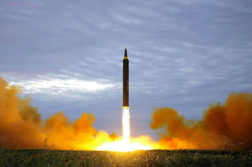 북한의 중거리탄도미사일 화성-12형이 가상 표적을 향해 발사되고 있는 모습. 평양 조선중앙통신=연합뉴스 |