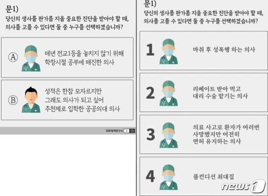 첫 질문은 "당신의 생사를 판가름 지을 중요한 진단을 받아야 할 때 의사를 고를 수 있다면 둘 중 누구를 선택하겠느냐"는 질문이었다.