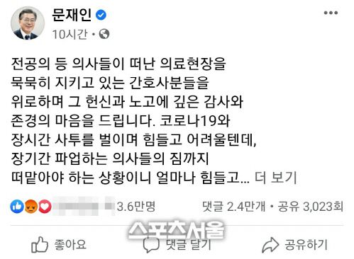 이 글에는 이날 오후 11시 기준 2만여개 댓글이 달렸고 실시간으로 댓글이 늘어나고 있다. 평소 문 대통령의 글에 1000~2000개의 댓글이 달리는데 이번엔 평소 대비 10배 많은 수준이다. 대다수 댓글이 문 대통령의 글을 비판하는 내용이다.