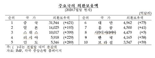 한국의 외환보유액 규모는 7월 말 기준(4천165억달러)으로 세계 9위 수준이다. 중국(3조1천544억달러)이 가장 많고, 일본(1조4천25억달러)과 스위스(1조17억달러)가 뒤를 이었다.