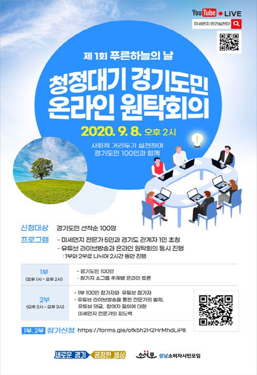 경기도는 오는 8일 오후 1시부터 3시까지 UN이 정한 ‘제1회 푸른 하늘의 날’(9월 7일)을 맞아 도민 100명이 화상으로 참여하는 ‘청정대기 경기도민 온라인 원탁회의’를 개최한다고 3일 밝혔다.