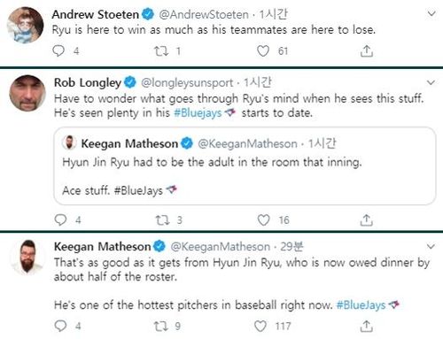 MLB 닷컴의 키건 매티슨 기자는 "토론토 구단 메이저리그 로스터에 포함된 절반의 선수는 류현진에게 빚졌다"며 "저녁 식사를 대접해야 할 것"이라고 전했다.