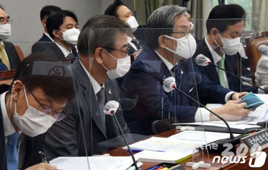 (서울=뉴스1) 신웅수 기자 = 노영민(왼쪽 세 번째) 대통령비서실장이 2일 오후 서울 여의도 국회에서 열린 운영위원회 전체회의에서 질의에 답하고 있다. 왼쪽부터 김상조 정책실장,서훈 국가안보실장,노영민 비서실장,김영춘 국회사무총장. 2020.9.2/뉴스1 |