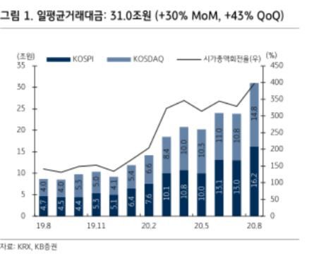 이처럼 거래대금이 급격하게 늘어난 것은 개인투자자들 덕이 크다. KB증권에 따르면 지난 8월 한달간 거래대금에서 개인이 차지하는 비중은 79.2%로 80%에 육박했다. 개인투자자들이 지난 3월 코로나19 발발을 기점으로 증시에 돈을 쌓기 시작했고, 이것이 활발한 유동성과 초저금리 상황, 부동산 규제 등으로 지금까지 계속 이어지고 있는 것이다.