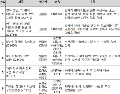 세계 1위 양자보안 기술 업체 IDQ를 인수한 SK텔레콤이 제안한 2건의 표준이 국제전기통신연합 전기통신표준화 부문(ITU-T) 표준안에 사전 채택됐고, 현대자동차, 한국전자통신연구원(ETRI), 카카오모빌리티, 고려대, 등이 함께한 자율주행차 보안 표준도 총 2건이 채택됐다.