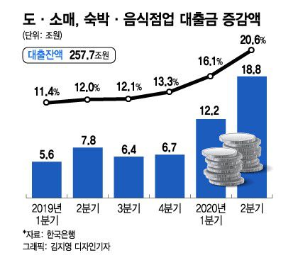 긴급대출이 아닌 형태의 대출까지 포함하면 대출규모는 더욱 커진다. 한국은행이 2일 발표한 '2020년 2분기 예금취급기관 산업별 대출금 조사'에 따르면 올해 상반기 은행 등을 통한 도소매·숙박·음식점업 전체 대출은 상반기에만 31조원 증가했다. 전년동기(13.4조원) 대비 2배 이상 급증한 규모다. 도소매·숙박·음식점업이 대부분 소상공인에 집중된 점을 감안하면 소상공인들의 대출이 전년보다 2배가량 늘었다는 의미로 풀이된다.