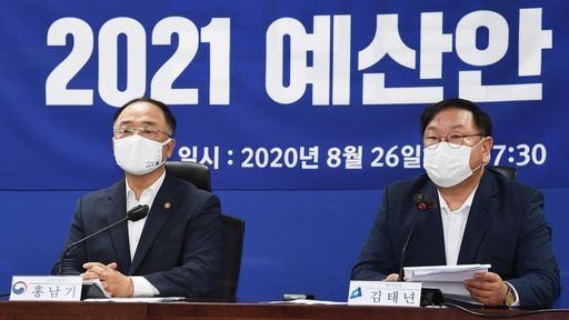 더불어민주당 김태년 원내대표(오른쪽)와 홍남기 경제부총리. 연합뉴스 |