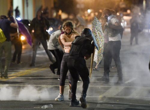 미국 뉴욕주 로체스터에서 3일(현지시간) 인종차별 반대 시위 참가자들이 최루액에 맞서 우산을 들고 있다. 로체스터/AP연합뉴스 |