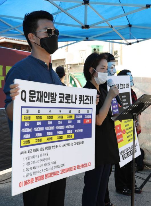 사랑제일교회의 강연재 변호사 등 변호인단이 3일 오후 서울 성북구 사랑제일교회 앞에서 경찰이 전날 전광훈 목사의 사택 등 교회 관련 시설을 압수수색 한 것 등과 관련해 입장발표 기자회견을 하고 있다. <사진=연합뉴스> |