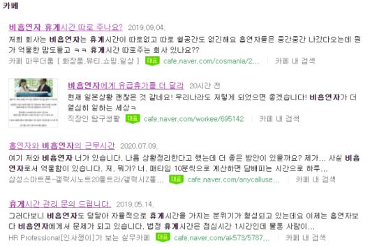 한 포털사이트에 비흡연자 휴게시간과 관련한 카페 게시글들이 올라와있다. (사진=네이버 캡처) |