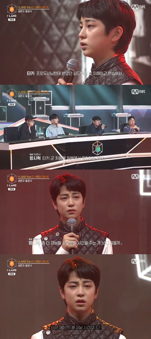 타키는 아쉬운 작별인사를 전했다. 타키는 "이 꿈을 포기하지 않고 프로듀서님한테 받았던 피드백을 잘 이해하고 연습해서 다음 기회에 더 잘하고 싶다. 정말 감사하다"라고 소감을 남겼다. 방시혁은 "타키군이 처음 락킹을 하는 영상을 보고 너무 귀여웠고 잘한다고 생각했다. 타키가 아이랜드에 들어와서 경쟁하면서 배우는게 맞나 라는 생각을 많이했다. 무대에 올라가니까 가지고 있는 걸 못보여준다라는 생각이 들었다. 꿈을 포기하지 않으면 이룰 수 있는 날이 반드시 온다"고 격려했다. /pps2014@osen.co.kr