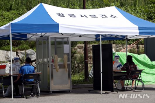 [강릉=뉴시스] 김경목 기자 = 23일 오후 강릉시 보건소 공무원들이 강원 강릉시 내곡동 보건소 선별진료소에서 신종 코로나바이러스 감염증(코로나19) 유증상자들의 몸에서 검체를 채취하고 있다. 2020.08.23. photo31@newsis.com |