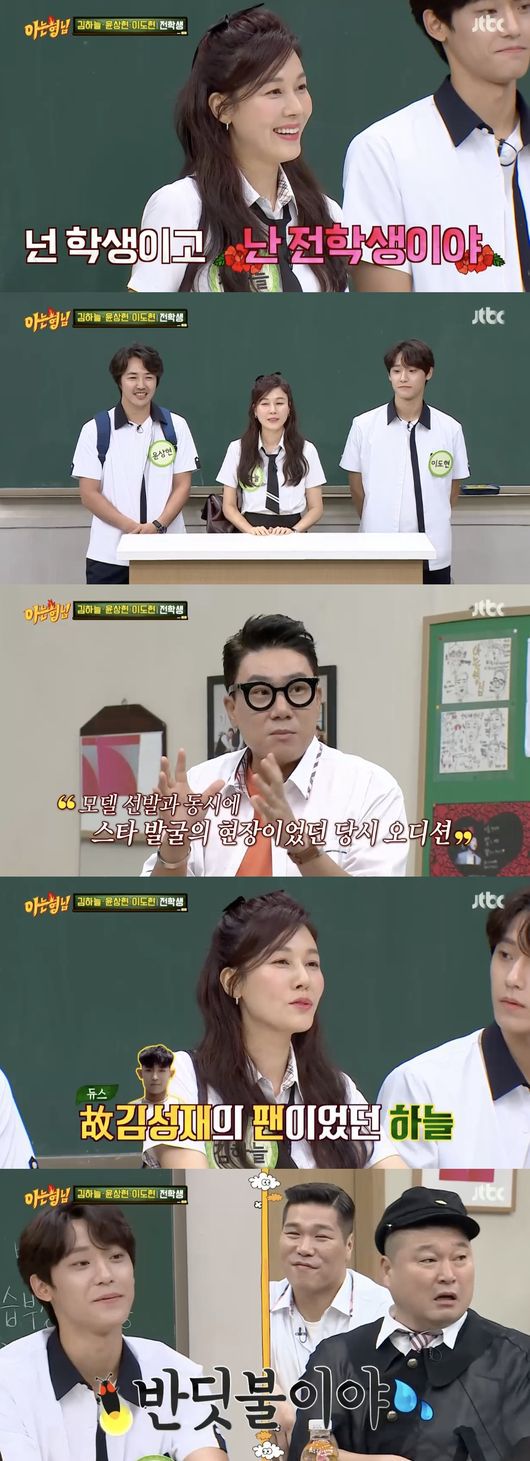 김하늘은 "넌 학생이고 난 전학생이야"라며 '로망스' 명대사를 하며 등장해 형님들을 설레게 했다. 이상민은 김하늘을 보고 "하늘이하고 추억이 있다"며 "첫 오디션을 봤을 때 내가 심사위원이었다. 스톰 모델 선발대회 오디션을 봤고 그 때 내가 심사를 했다"고 밝혔다.