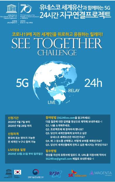 (서울=연합뉴스) 채새롬 기자 = SK텔레콤은 유네스코한국위원회, 마젠타 컴퍼니와 함께 5G 기술로 유네스코 세계유산을 전 세계에 소개하는 'SEE TOGETHER CHALLENGE(같이 보는 도전)' 이벤트 참여자를 7일부터 28일까지 모집한다고 6일 밝혔다.