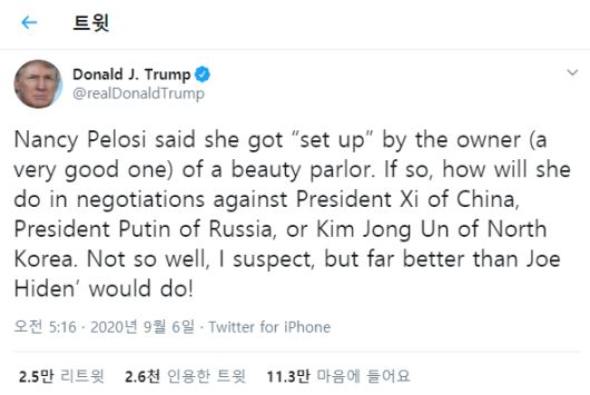 트럼프 대통령은 5일(현지시간) 자신의 트위터에 글을 올려 이같이 언급했다. 그는 미용실의 ‘작전’(set up)에 걸려들었다는 펠로시 의장의 주장을 언급하고는 “만약 그렇다면 시진핑 중국 국가주석, 푸틴 러시아 대통령, 김정은 북한 국무위원장과는 어떻게 협상할 것인가”라고 말했다.