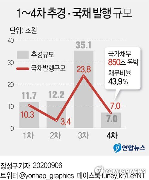 4차 추경을 위해 7조원의 적자국채를 추가로 발행한다면 국가채무는 846조4천억원으로 850조원에 육박하게 된다. 국가채무비율 역시 43.9%로 상승해 44%를 코앞에 두게 될 전망이다.