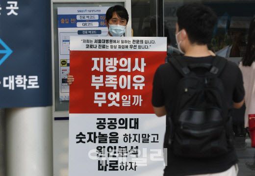 전국의사 2차 총파업 첫날인 26일 오후 서울 종로구 서울대학교병원에서 한 전문의가 의과대학 정원확대 등 정부의 의료정책을 반대하는 손팻말을 들고 있다. (사진=방인권 기자) |
