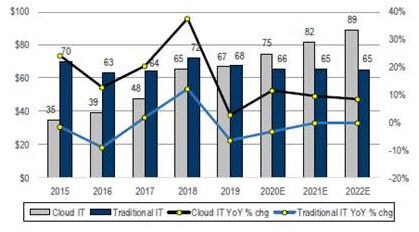 CS는 글로벌 클라우드 IT 인프라 관련 지출이 지난 2019년부터 오는 2022년까지 3년간 연평균 성장률 10%를 기록하며, 오는 2022년에는 890억 달러 수준을 기록할 것으로 전망했다. 같은 기간 전통적인 IT 인프라 지출이 650억 달러 수준을 기록할 것에 비하면 높은 성장세를 예상한 것이다.