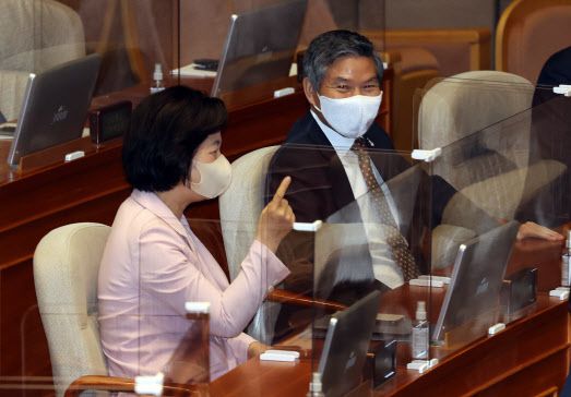추미애 법무부 장관이 7일 오전 국회 본회의장에서 열린 이낙연 더불어민주당 대표의 교섭단체 대표연설에 참석해 정경두 국방부 장관이 대화하고 있다.(사진=연합뉴스) |