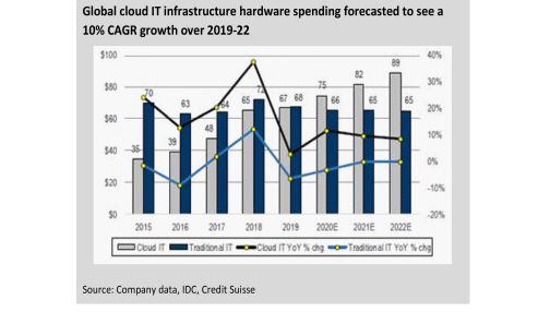 크레디트스위스는 향후 10년간 공급망의 성장은 5G와 클라우드 관련 기술이 주도할 것으로 내다봤다. 커넥티드 기기와 비디오 애플리케이션 증가, 기업 및 소비자의 클라우드 서비스 이용 확산, 인공지능(AI) 데이터 애널리틱스 가속화로 글로벌 클라우드 IT 인프라 관련 지출은 2019년부터 2022년까지 3년간 10%의 연평균 성장률(CAGR)을 기록하며 2022년 890억달러에 이를 것으로 예상된 반면, 같은 기간 전통적 IT(정보기술) 인프라 관련 지출은 매년 650억달러 수준에 머무를 것으로 전망됐다.
