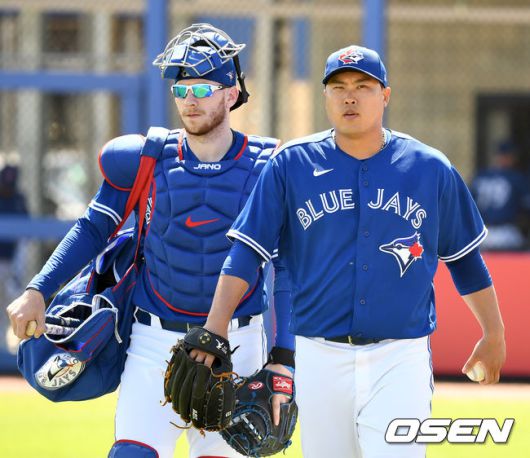 [OSEN=더니든(미국 플로리다주) ,최규한 기자]경기 시작을 앞두고 토론토 선발 류현진과 포수 대니 잰슨이 더그아웃으로 향하고 있다. /dreamer@osen.co.kr |
